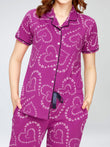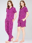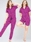 ZEYO Night Suit for Women's Purple Heart Printed Cotton Night Dress of Shirt,Pajama & Short's 3Pc'S Set
