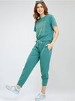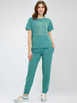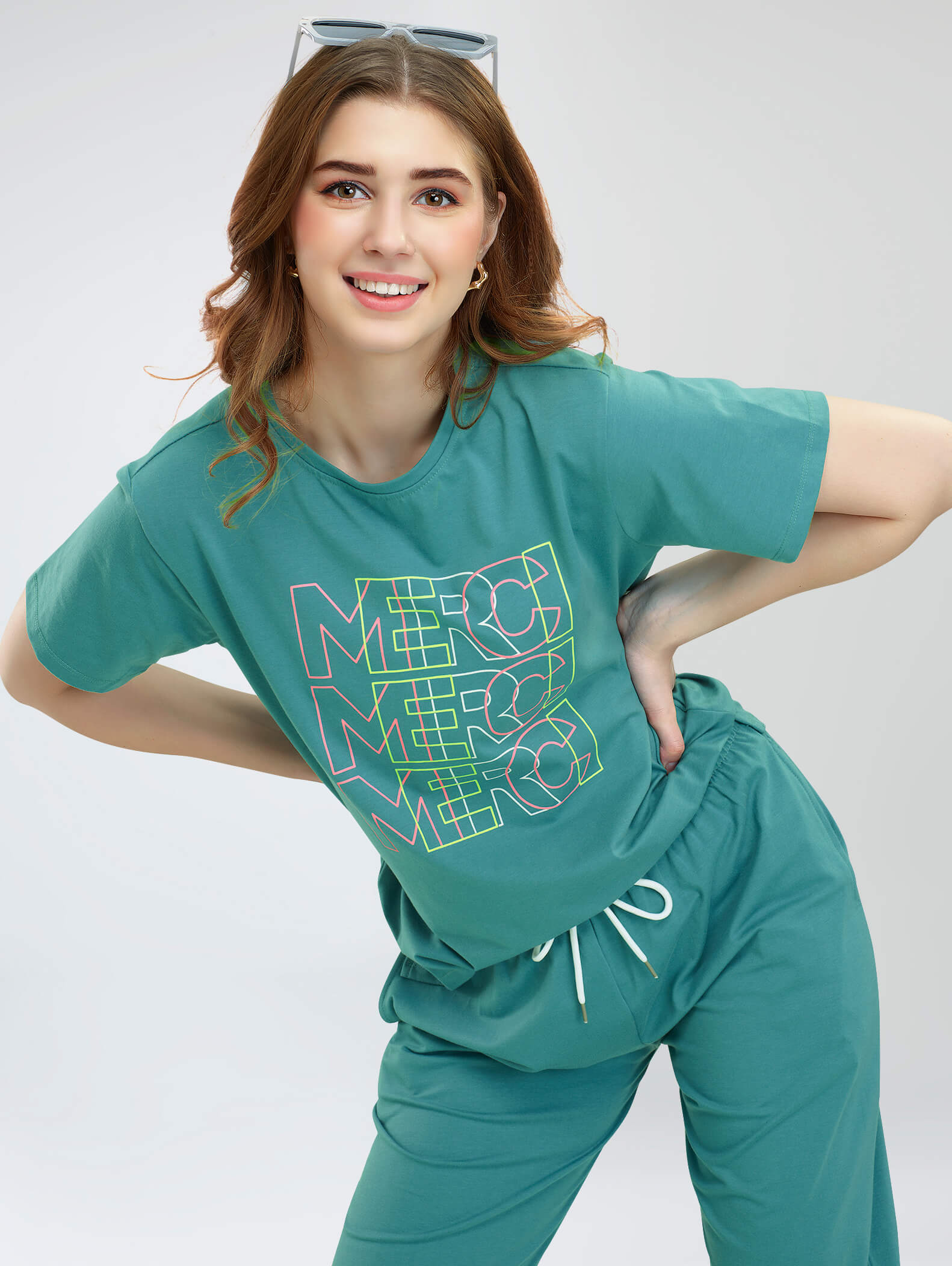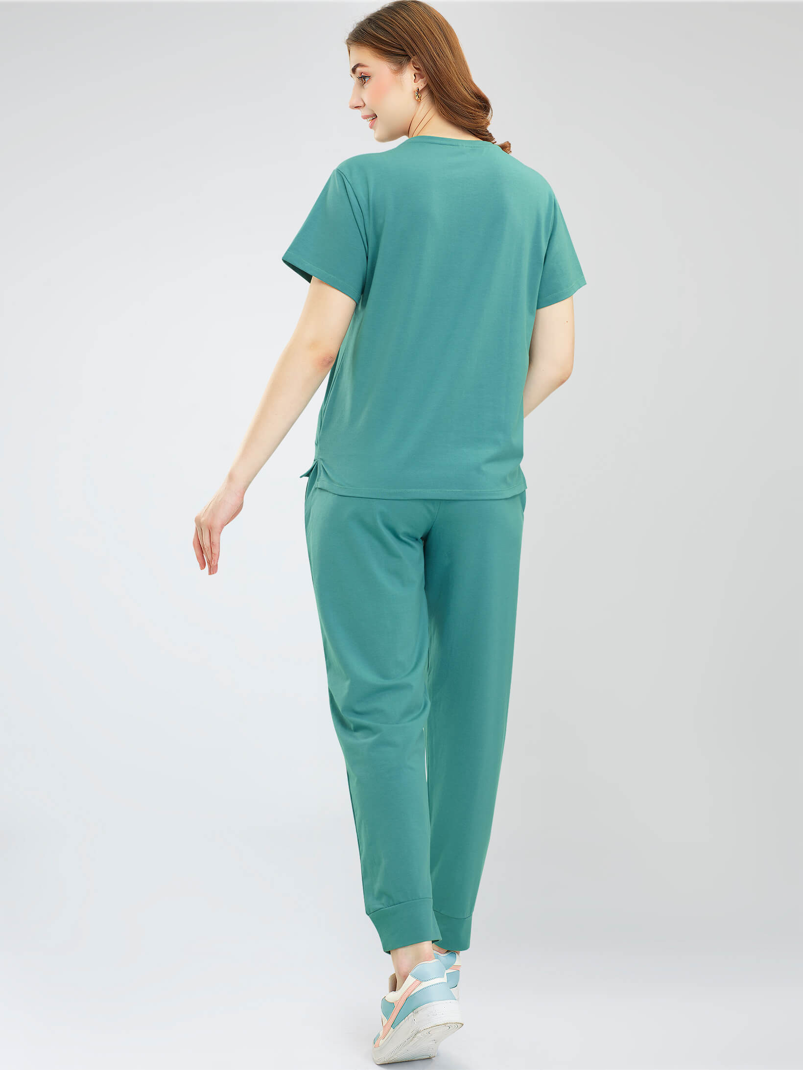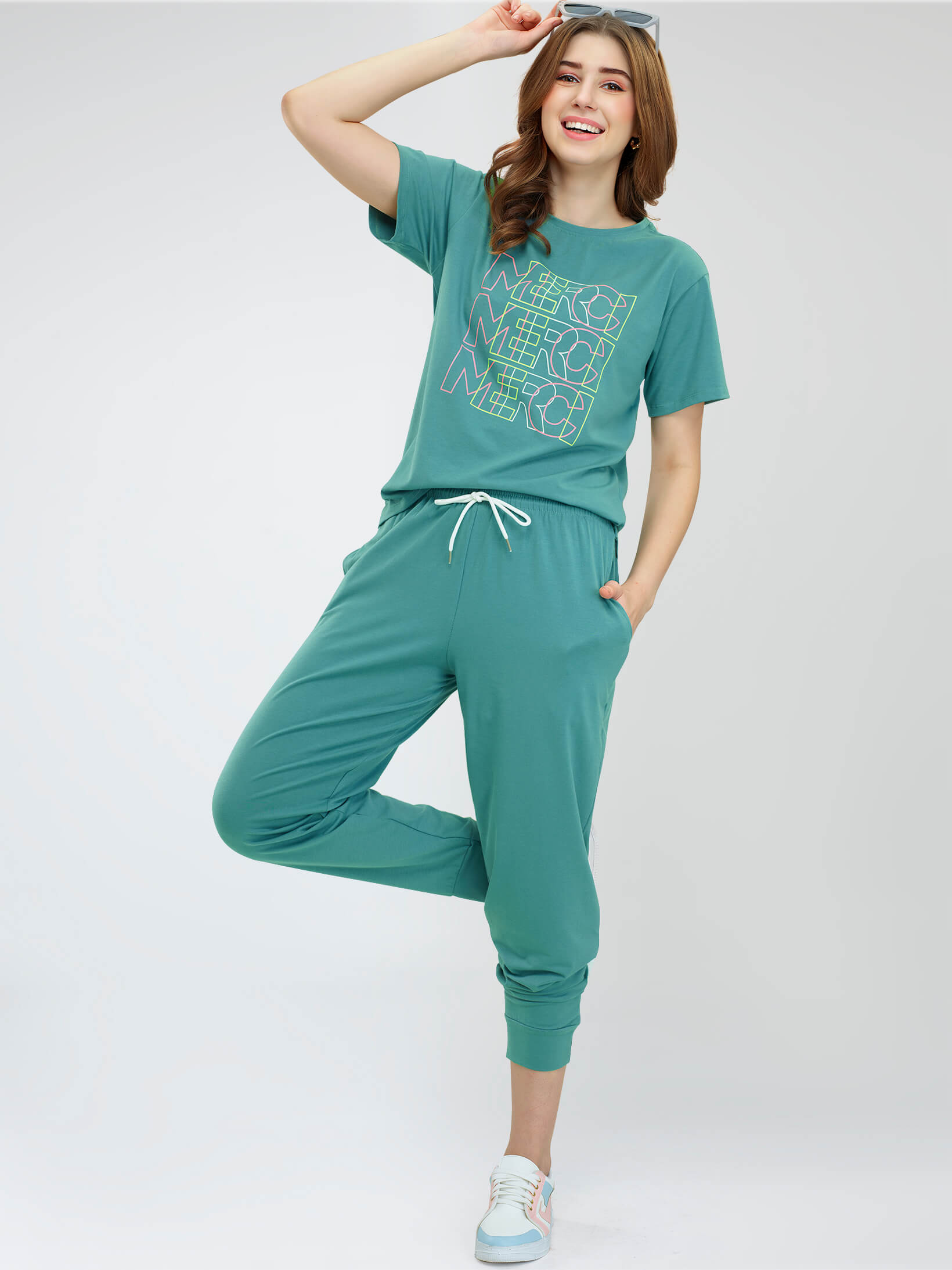 ZEYO Women's Cotton Green Typography Printed Night Suit Set of Top & Joggers