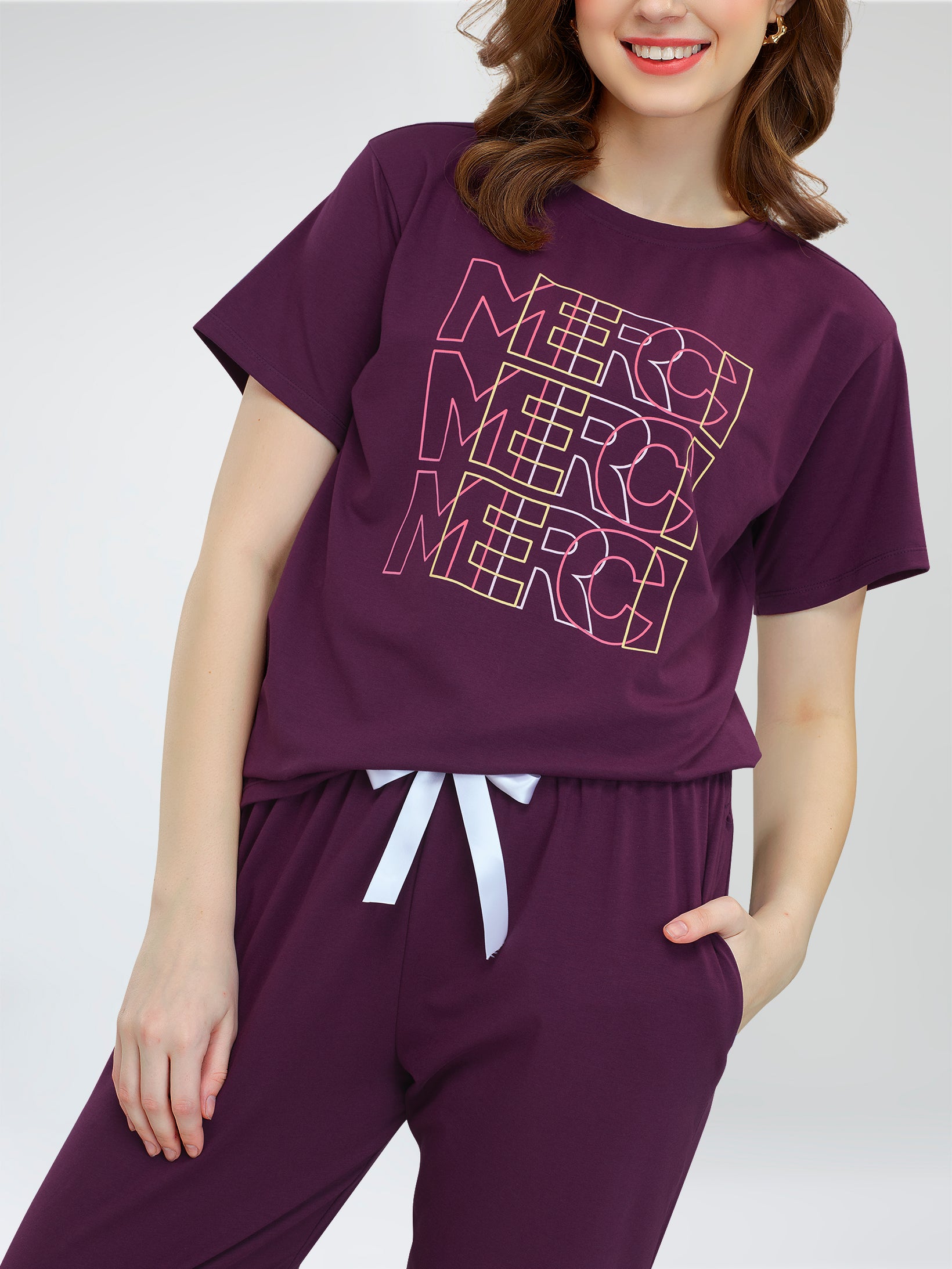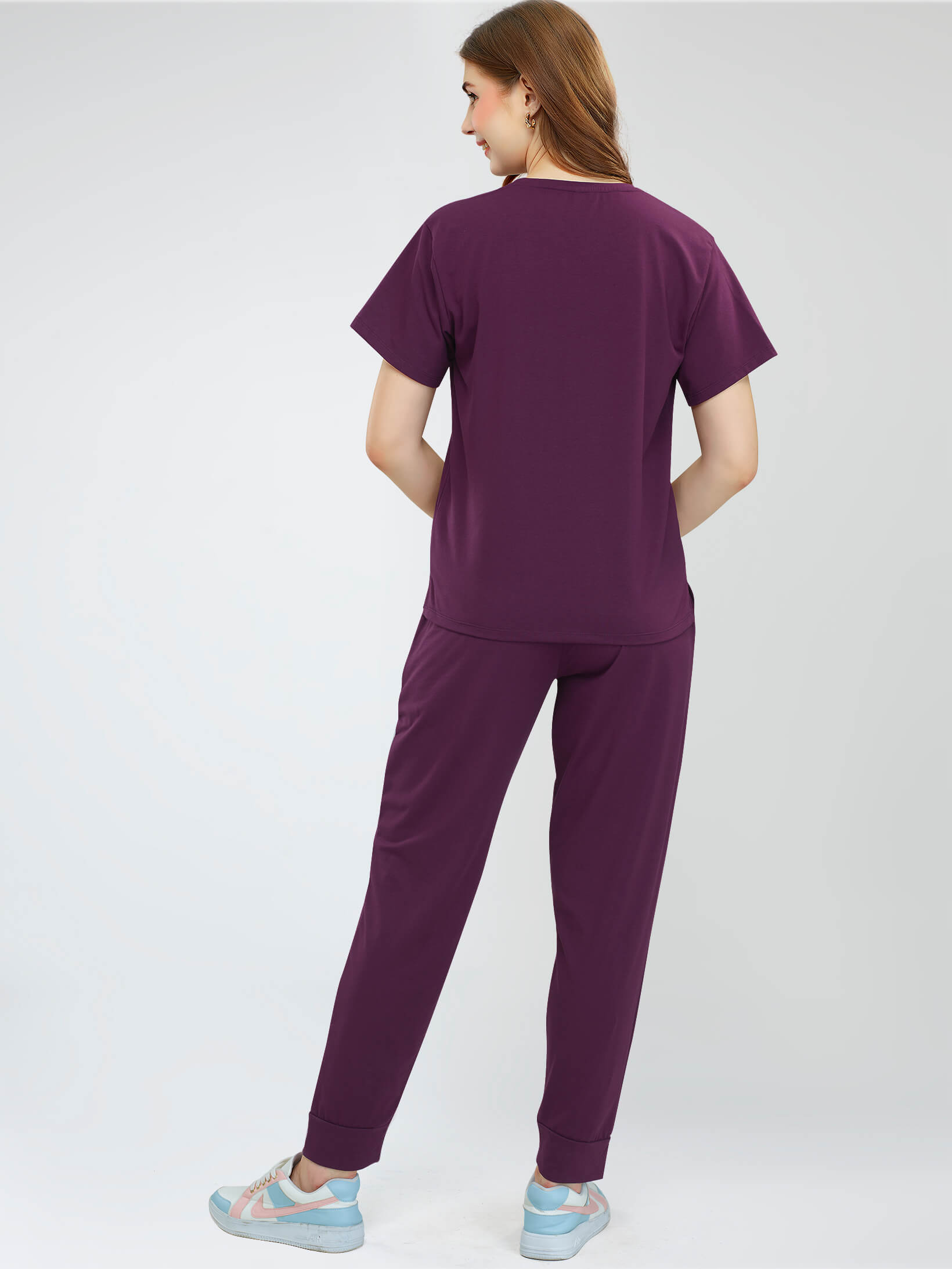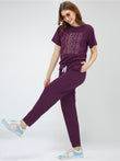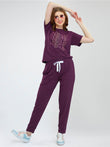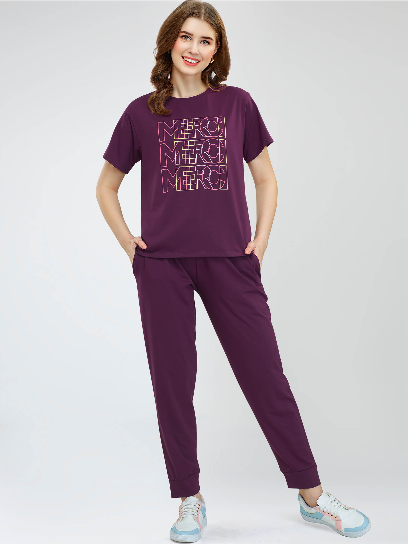 ZEYO Women's Cotton Wine Berry Typography Printed Night Suit Set of Top & Joggers
