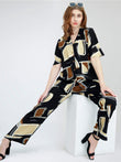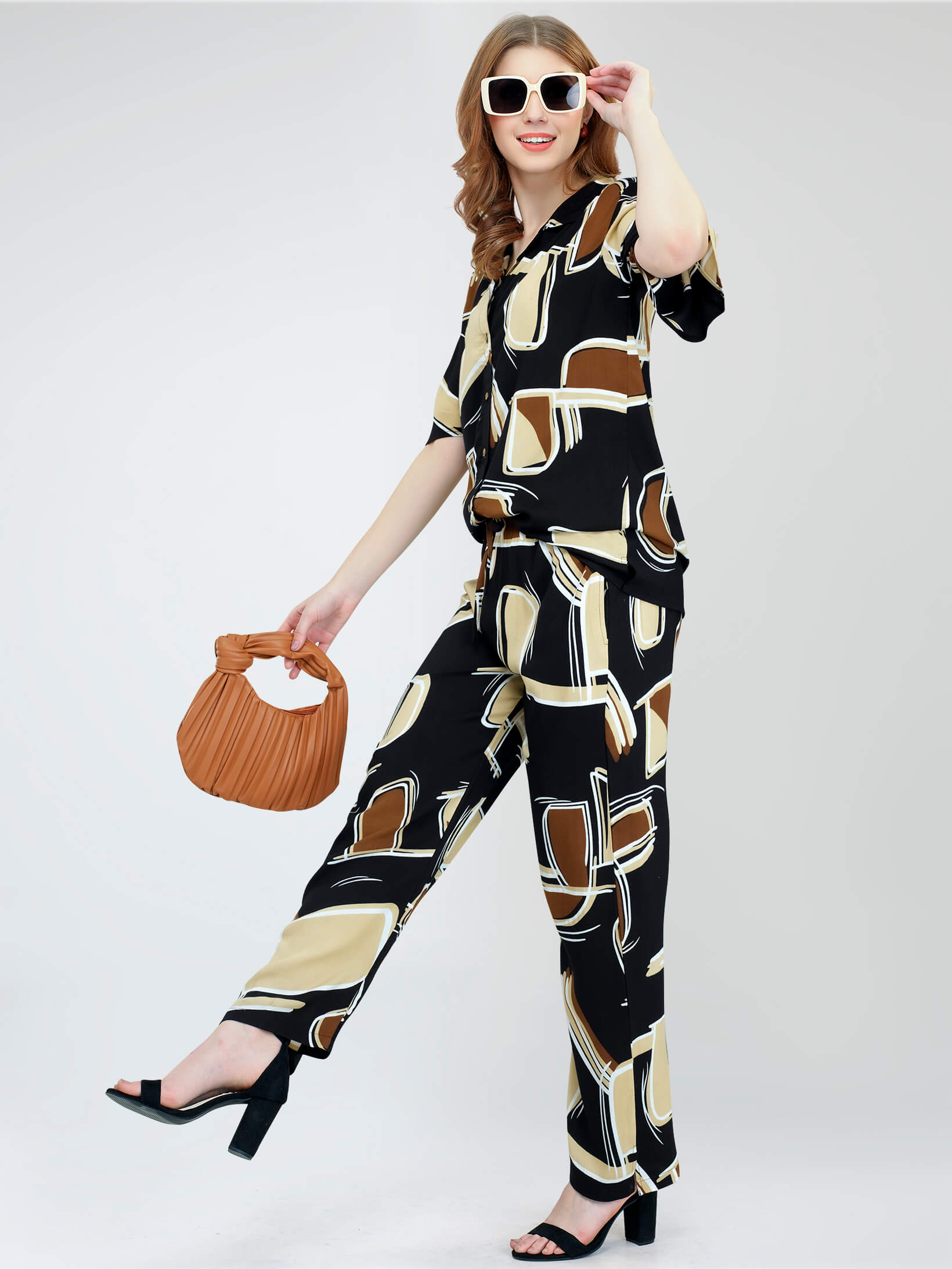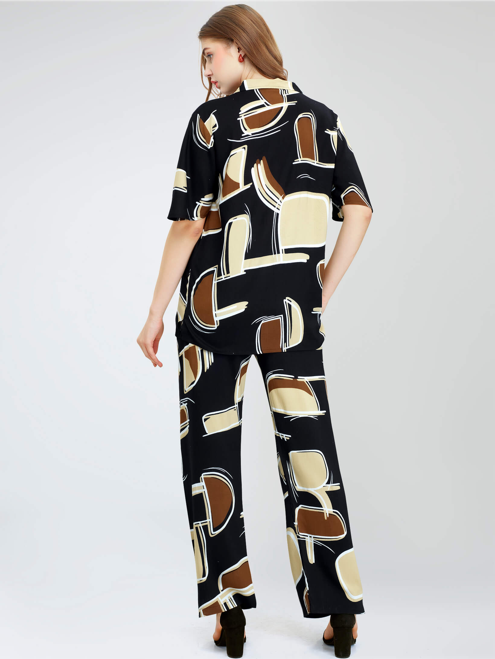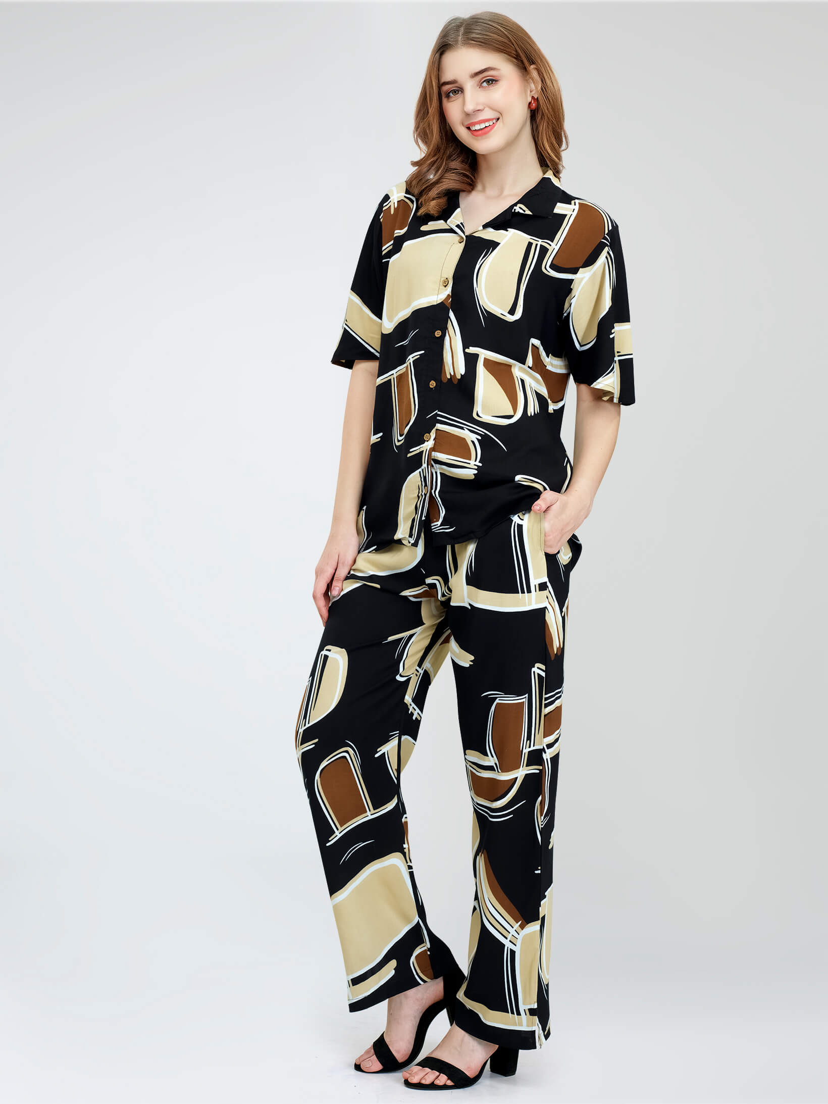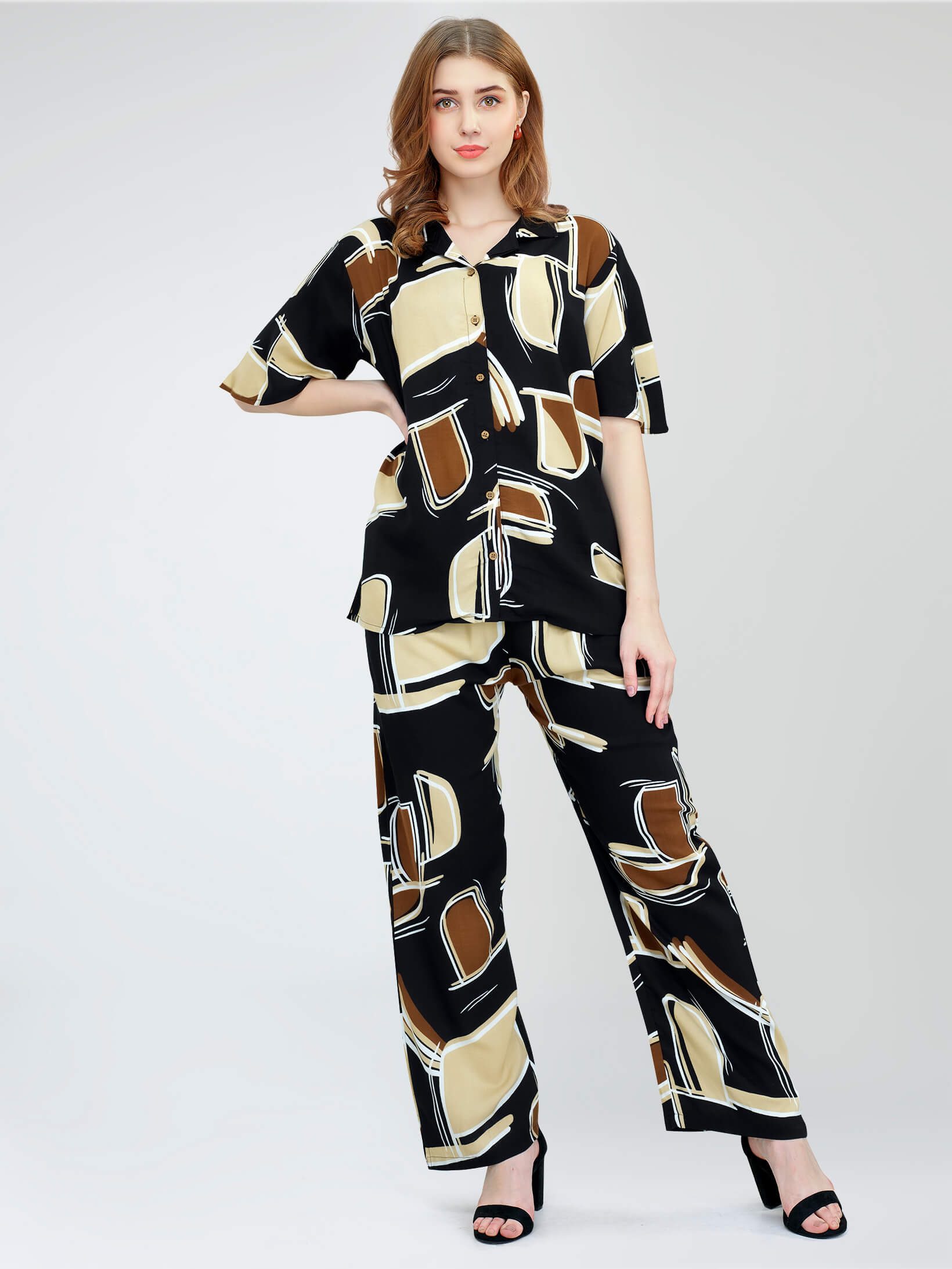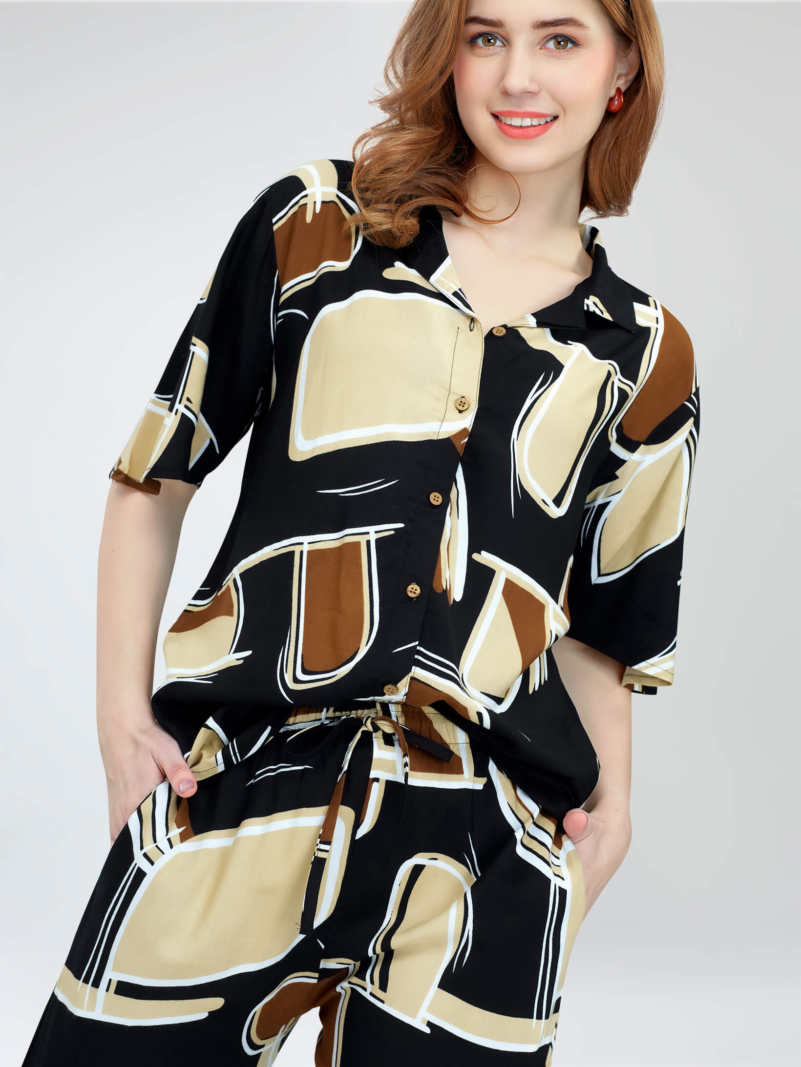 ZEYO Women's Rayon Brown Printed Night Suit Set of Shirt & Pyjama