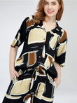 Brown & black printed shirt, has lapel collar, short sleeves, button closure and regular waist hem