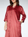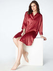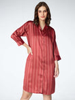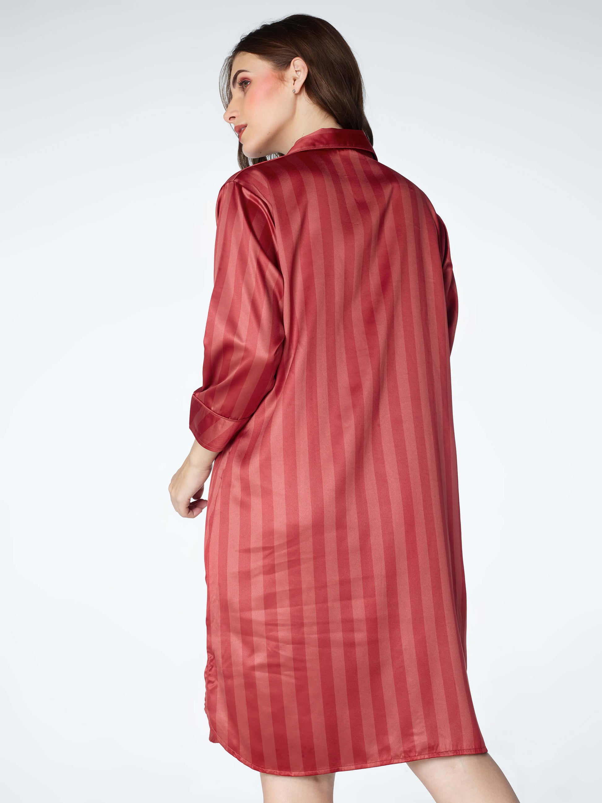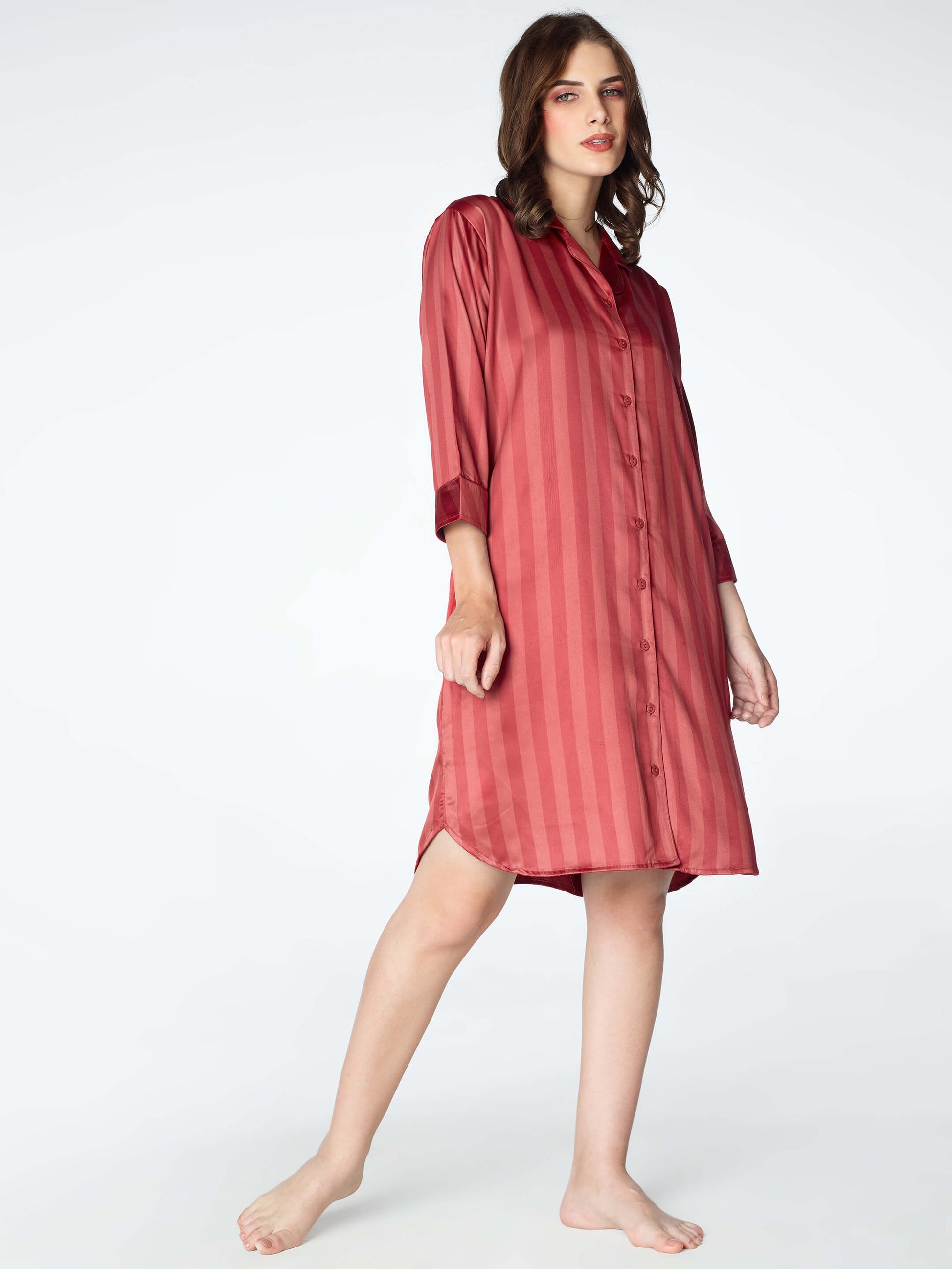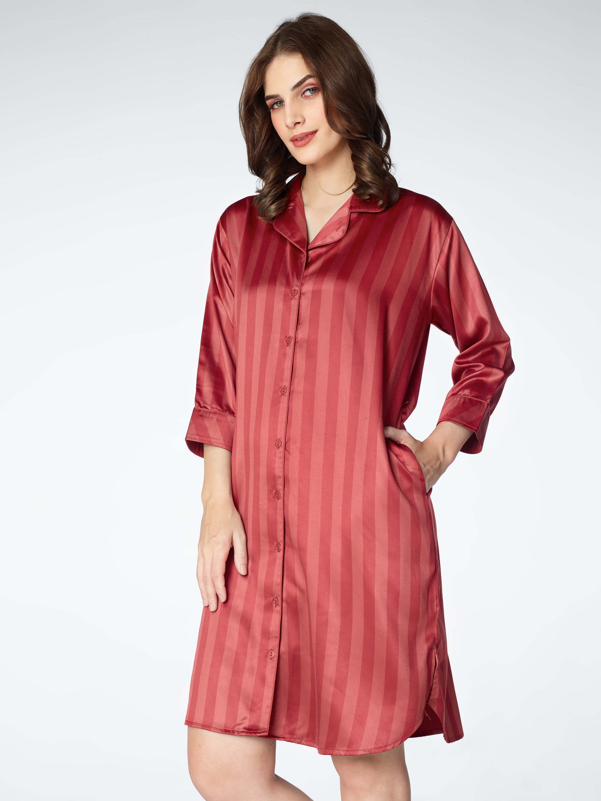 Zeyo Women Satin Red Stripes Print Night Dress Sleep shirt