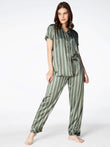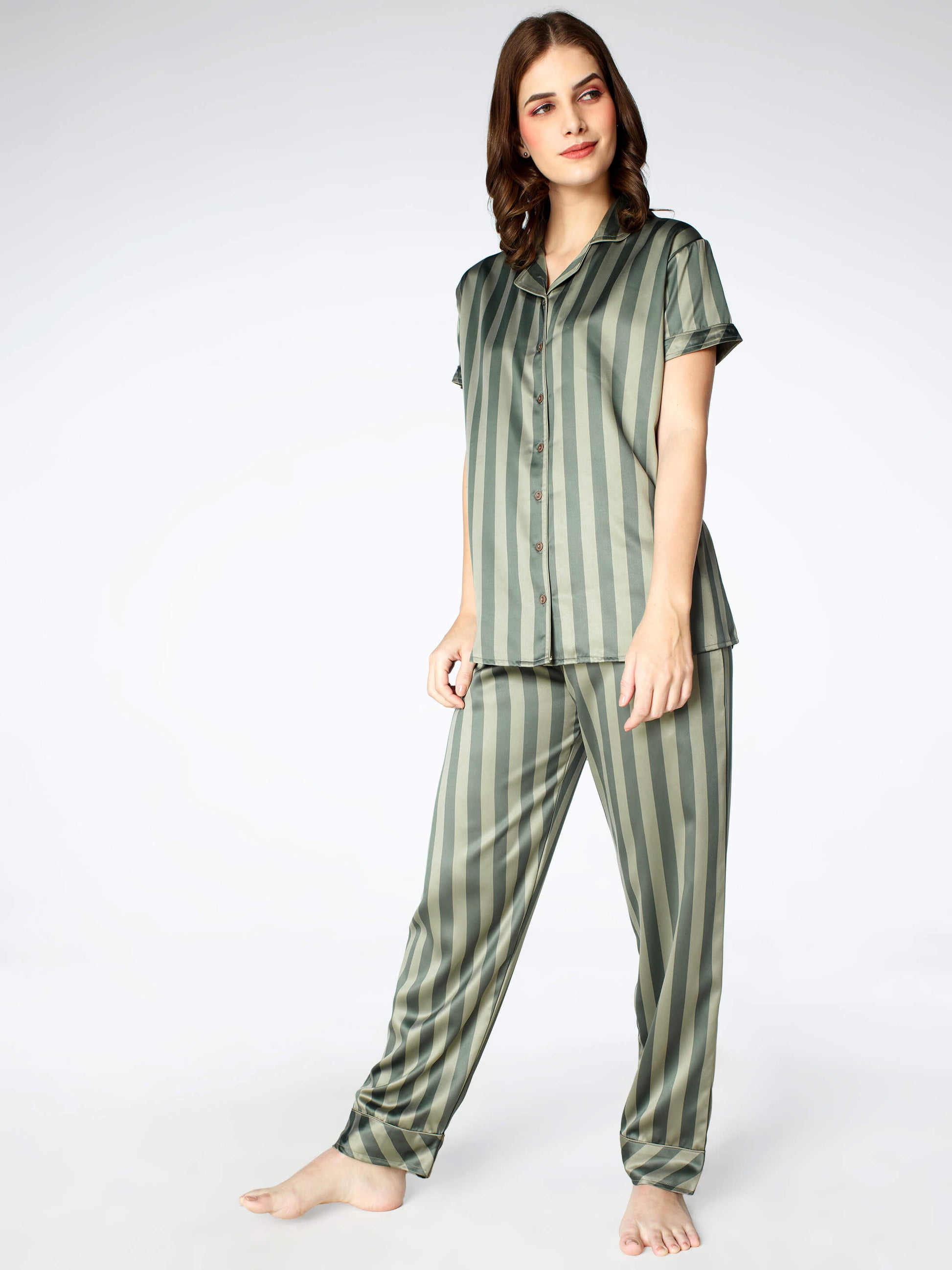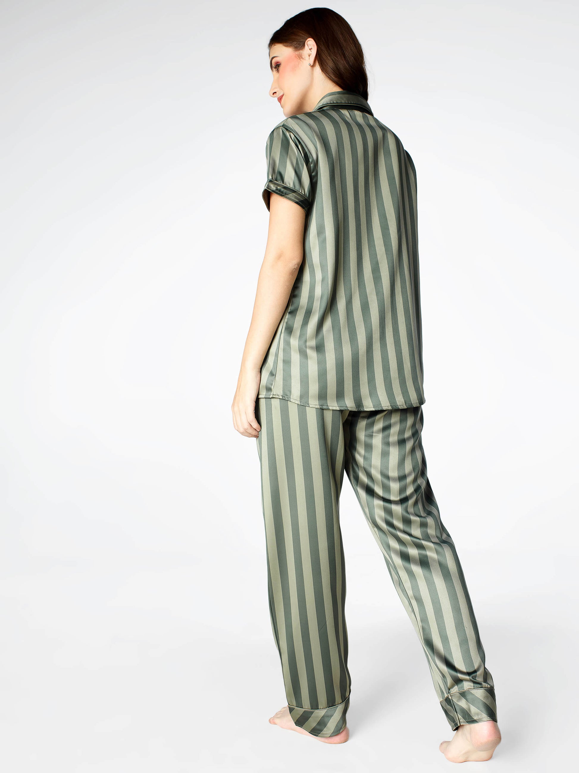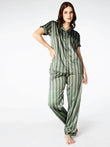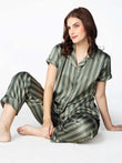 Zeyo Womens Satin Stripes Printed Night Suits Olive Green Shirt & Pyjama set