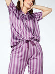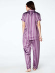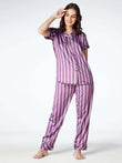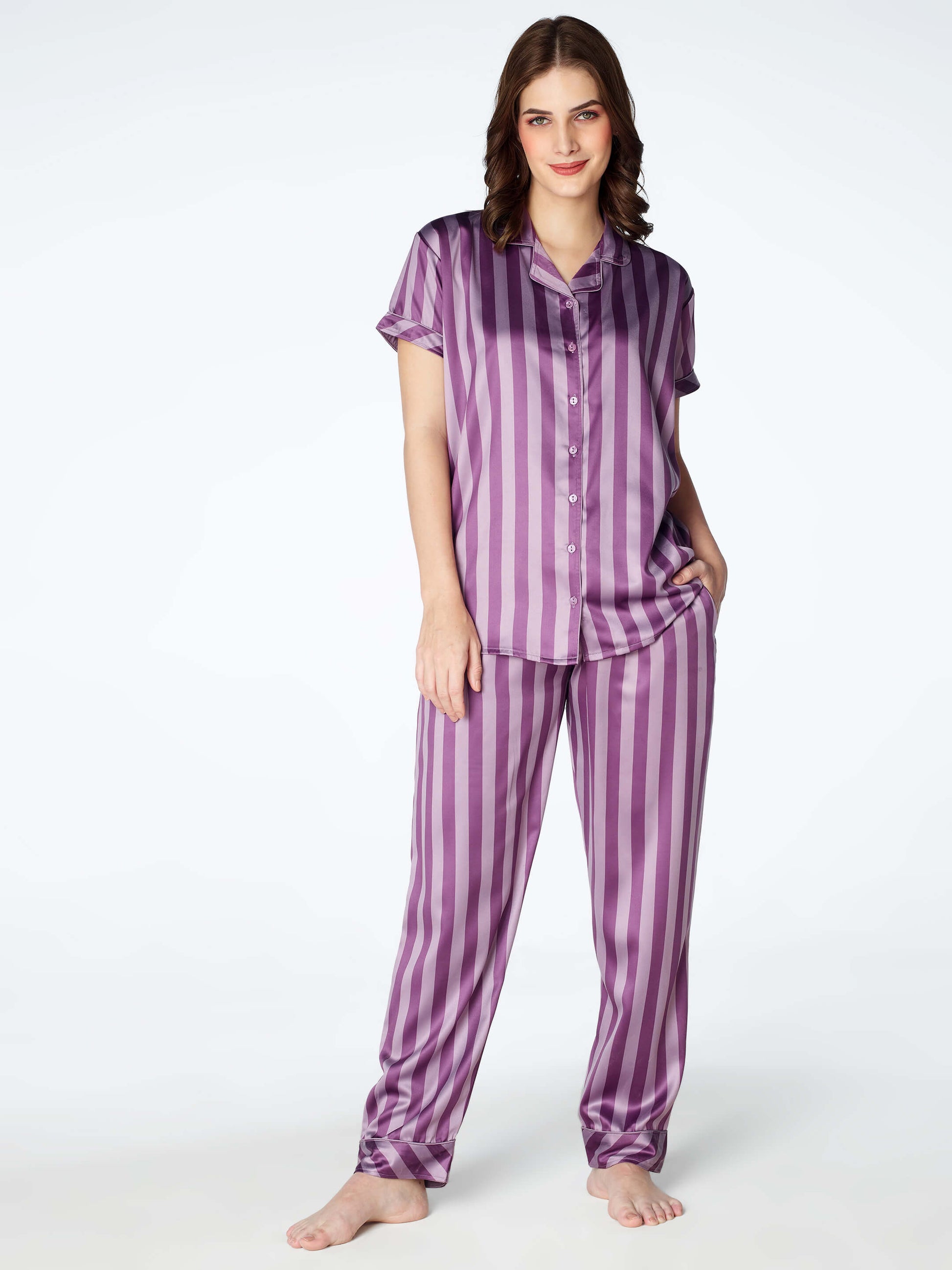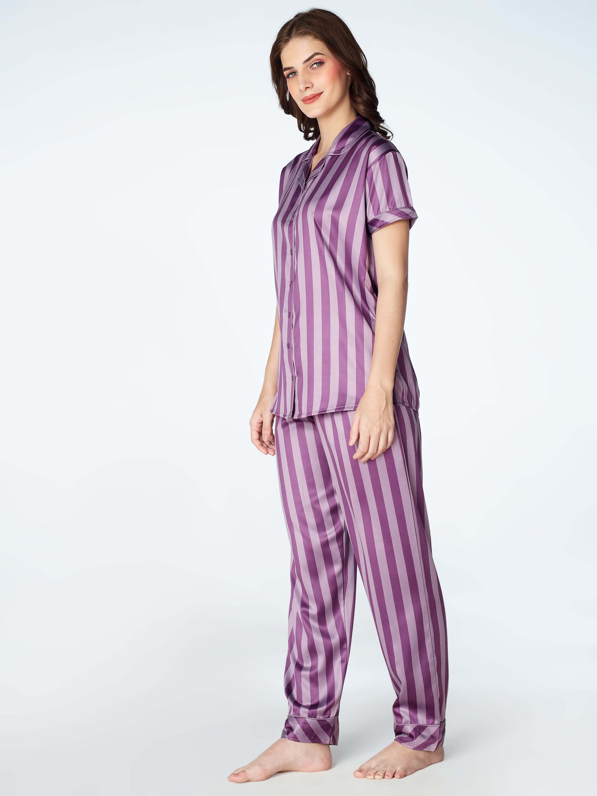 Zeyo Womens Satin Stripes Printed Night Suits Purple Shirt & Pyjama set