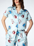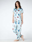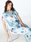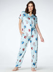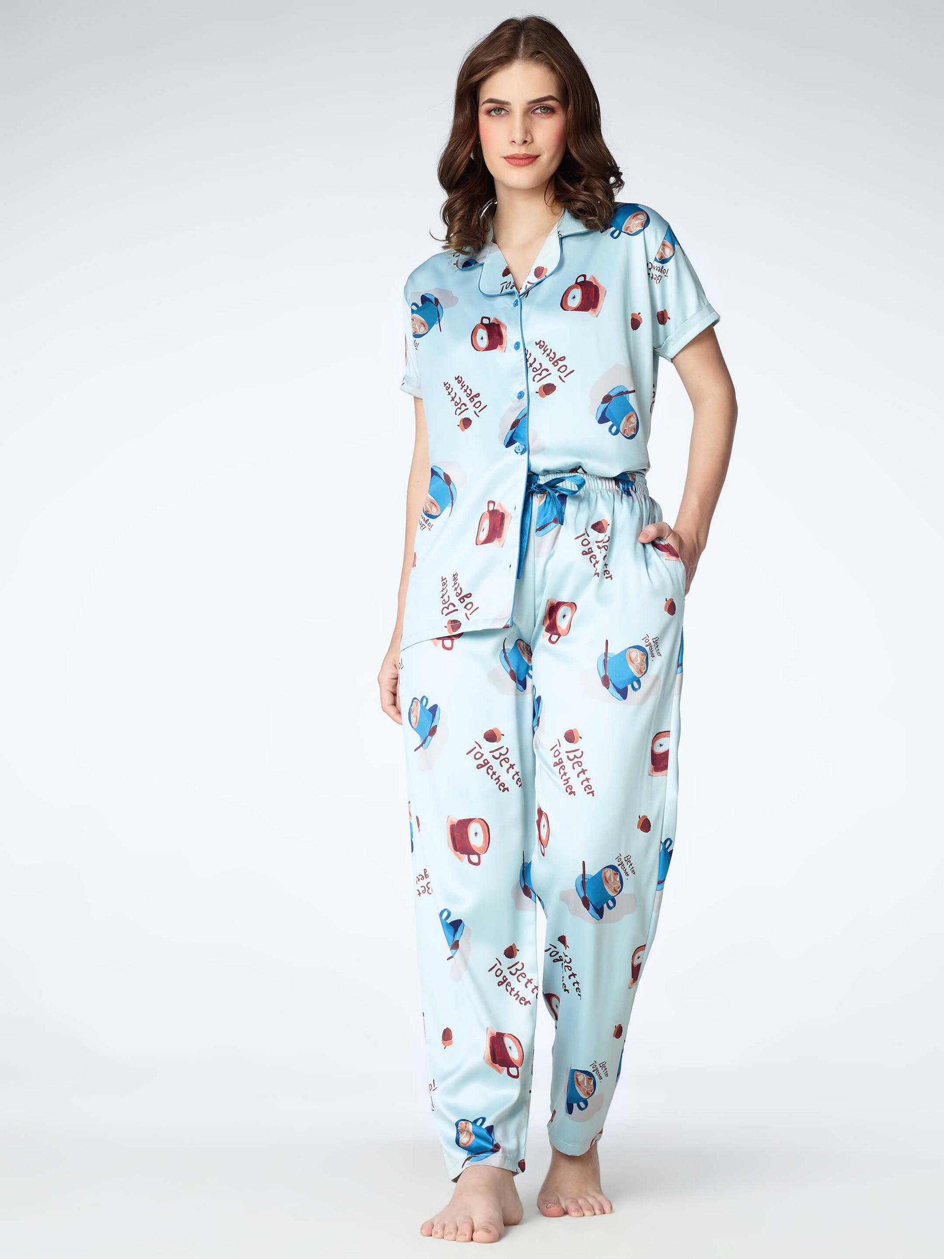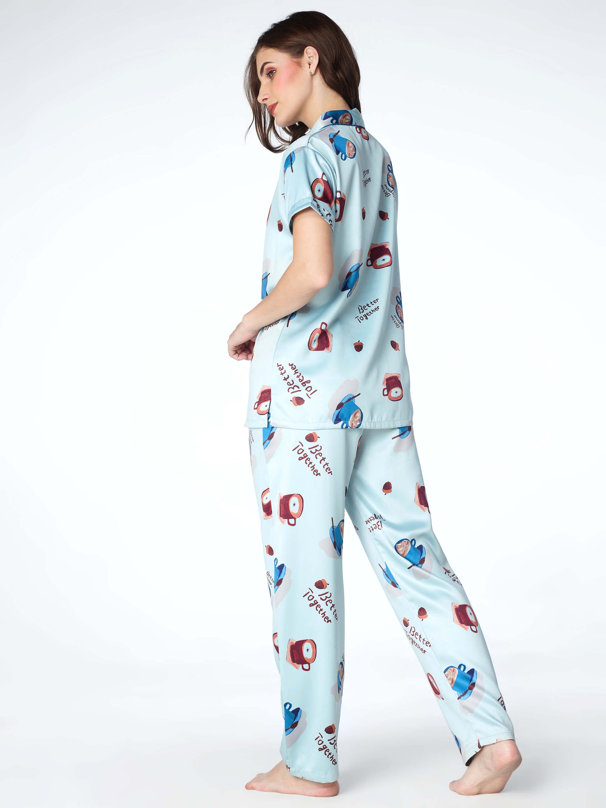 Zeyo Womens Satin Tea Cup Printed Night Suits Light Blue Shirt & Pyjama set