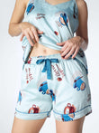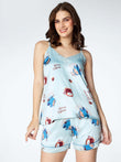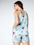 Zeyo Womens Satin Tea Cup Printed Night Suits Light Blue Top & Short set